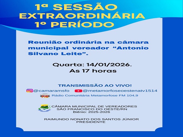 O Presidente da Câmara Municipal de vereadores de São Francisco do Oeste/RN, vereador Raimundo Nonato dos Santos Júnior e demais Vereadores, convidam a todos a participarem da 1ª Sessão Extraordinária do Primeiro período legislativo que acontecerá amanh4 (12/01/2026), a partir das 17h00min. no Plenário Luiz da Silveira Rocha.