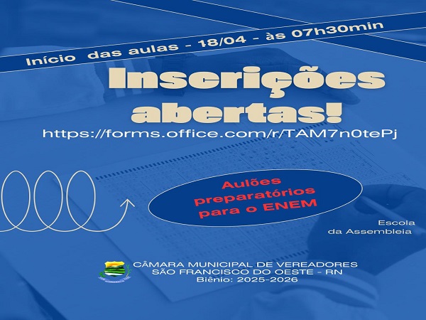 A iniciar no próximo dia 18 de abril de 2026, o Integra ENEM trabalhará conteúdo da prova através de transmissões virtuais, que acontecerão aos sábados, das 07h30 às 12h30min, no Salão de reuniões da Câmara Municipal de vereadores de São Francisco do Oeste.